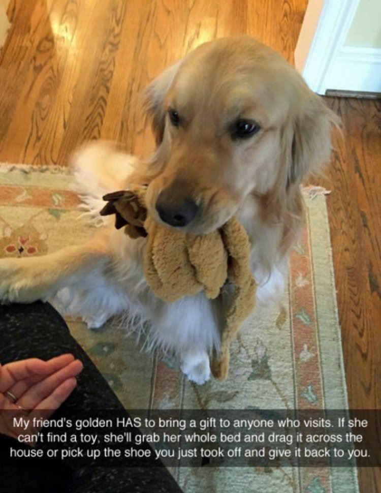 Gifts from the golden My friends golden has to bring a gift to anyone who visits.. No matter what.