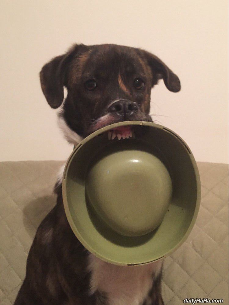 Got my dish This dog has a great way of presenting his dish.